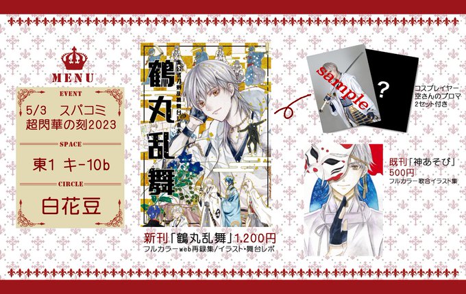 ♥5/3閃華「鶴丸乱舞」B5/54P♥ ★フルカラーweb再録イラスト集 鶴丸メインのイラスト・舞台レポ等 ★空さん@hoippuichigoのブロマ2セット付き(会場限定) pixivのサンプルはこちら↓ pixiv.net/artworks/10754…