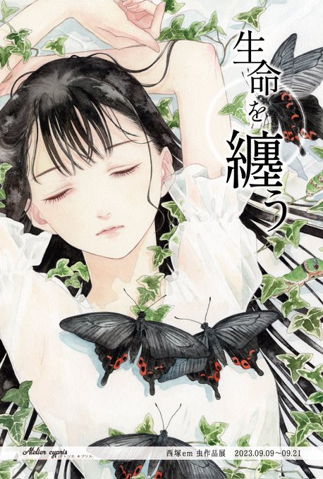 【告知】西塚em虫作品展「生命を纏う」を開催します 🦋2023/9/9(土)〜9/21(木) 月祝,13日休廊 🦋13:00〜18:00 🦋大阪 アトリエキプリス(@Atelier_cypris ) 「生活と愛玩」をテーマに幼虫たちの絵を展示します。同時期に隣室でイモムシ展も開催されるとの事 虫好きな方是非遊びに来てください🐛
