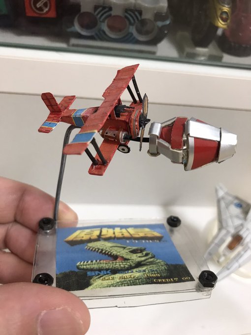 10年位前に初めて作った #ペーパークラフト の #原始島 の自機をペタリw #シューティングゲームヒストリカ くらいのサイズで作り、土台にはゲームタイトル画面の恐竜くん 激ムズでマイナーなゲームでしたが 友達と遊んだ楽しい思い出のゲーム🦖 #SNK #PrehistoricIsle