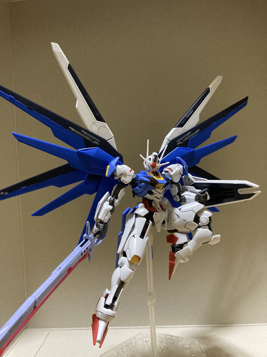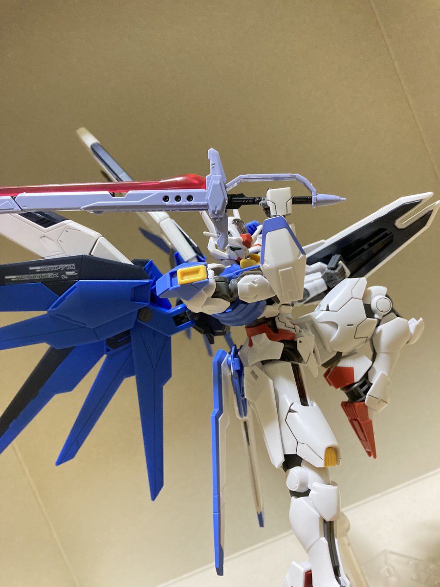 hg フリーダムガンダム× hg ガンダムエアリアル+αデスティニー 深夜ノリで作ったプラモにrgデスティニーの武器を無理矢理持たせてポーズ取らせました!結構かっこよくて個人的には気に入ってます! #ガンプラ #ガンプラの画像貼るとRTされると聞いて #ガンプラ好きと繋がりたい #gunpla