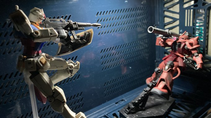 ガンダムvsザク! ビヨンドグローバルとオリジン版で統一感なくてゴメンナサイ💦 設定としてはザクの攻撃を避けて、ガンダムがカウンターを仕掛けてる設定です! #ガンプラ #ガンプラ好きな人と繋がりたい #ガンプラの画像を貼るとRTされると聞いて
