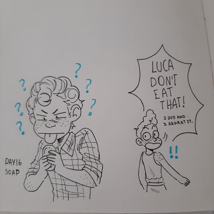 Day 16 - Soap Sometimes, Alberto is the one with brains and Luca has no thought in his mind Also, they probably thought soap looked edible #judraw #inktober #shiptober #inktoberday16 #day16 #luberto