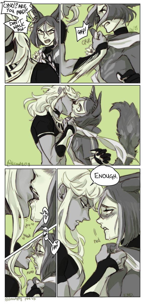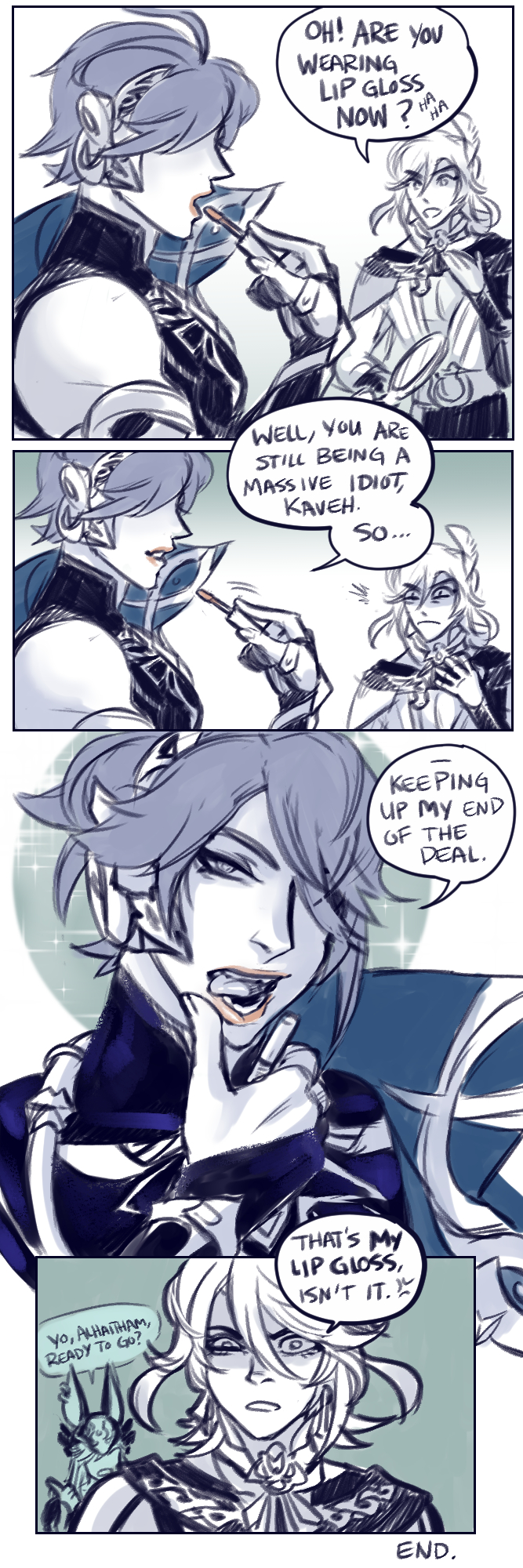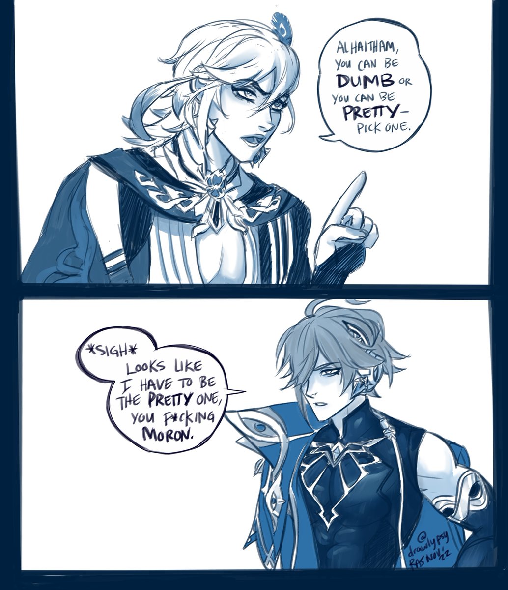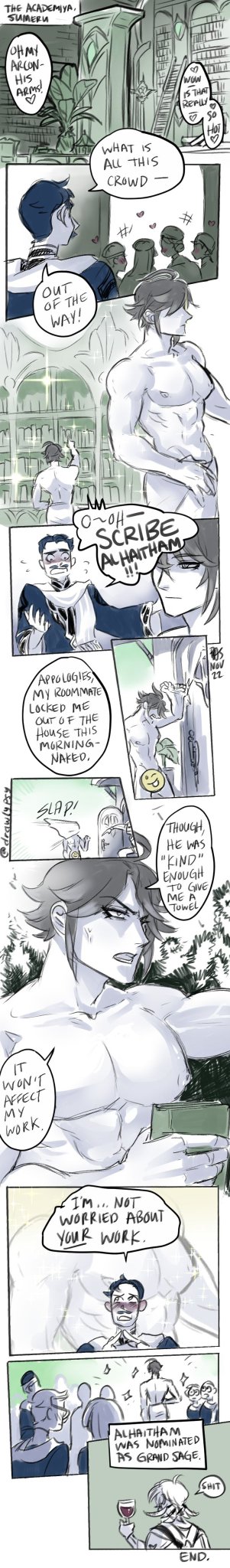 Part 2 of my #kavetham comic. Thank you, everyone, for enjoying this beautiful "friendship" unfolding before us. #alhaitham asserting his dominance as the pretty best friend is my new kink. #genshinimpactfanart #genshinimact twitter.com/drawlypsy/st…