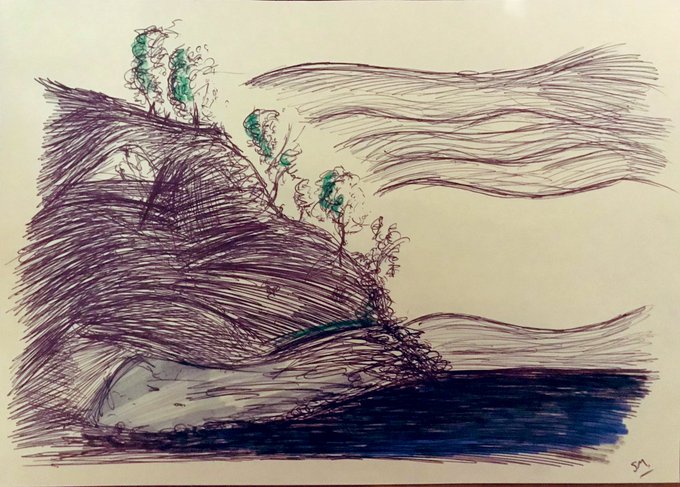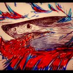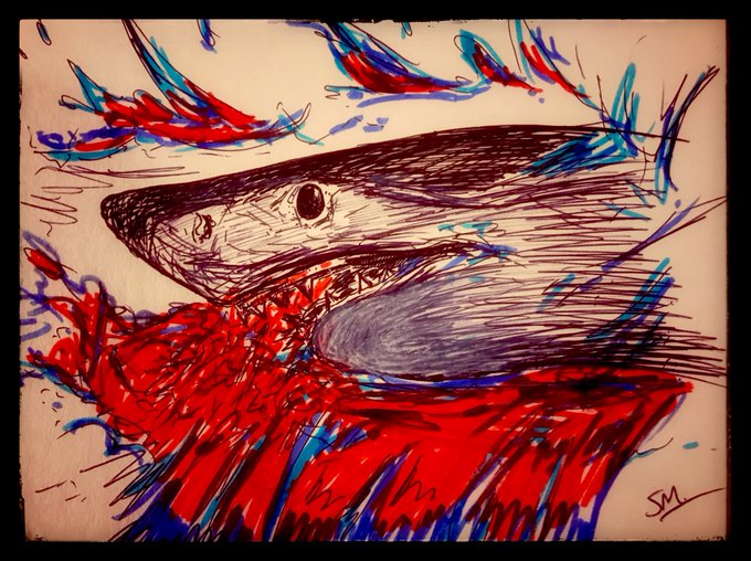 ‘Snack’ ~ #inktoberday27 #inktober2022 ~ getting ahead of myself but I’m enjoying the challenges so much! This is inspired by ‘Action Comics’ star shark, ‘HookJaw’ ~ I always loved the vibrant red of the blood in those comics ~ #sketchbook