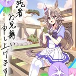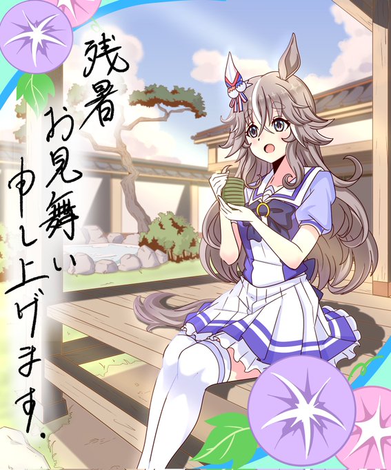 448 1789 描け麻雀で敗北したのでもらったお題を描きました😅 「縁側でお茶を飲むワンダーアキュート(残暑見舞い風)」です 素晴らしい眉毛ですね! #ウマ娘 22/09/03 22:10