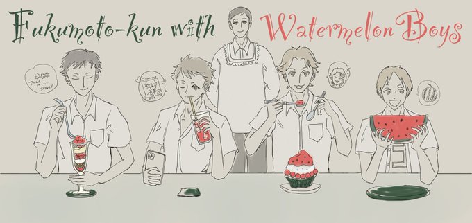 #ジョカゲ版深夜の真剣60分一本勝負 お題【おやつ】【西瓜】 『サンキューオカン』 7月31日のお題【西瓜】とあわせて 二学期が始まり、さっそく福本くんに🍉スイーツをねだる4人。でも波多野くんにはやはり🍉のまま抱えてほしくて… (本当はboys7人描きたかったけどワン+αでは力及ばす…🤦🏻)