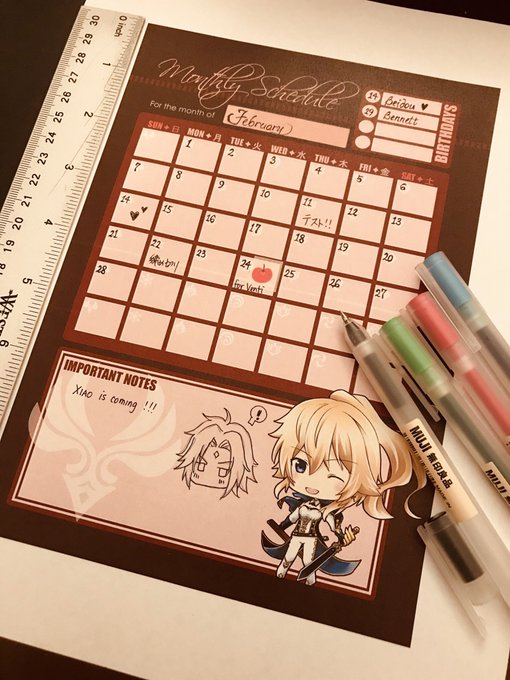 A quick test print of a page in the Genshin planner to check the size. Size is looking good! >w< Note the test page includes bleed and the actual product will have better colour and paper quality. Preorders open at khiwatari.storenvy.com/products/31447… #genshinimpactfanart #GenshinImpact