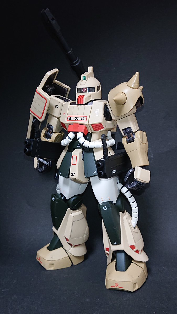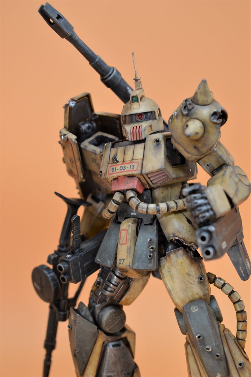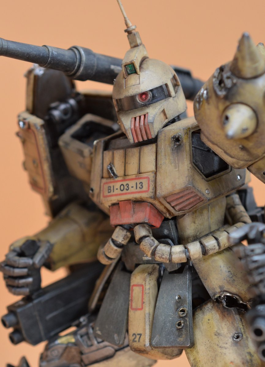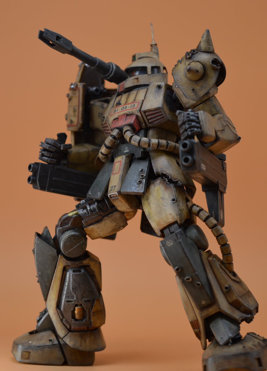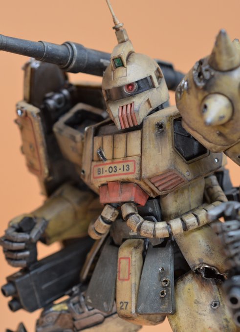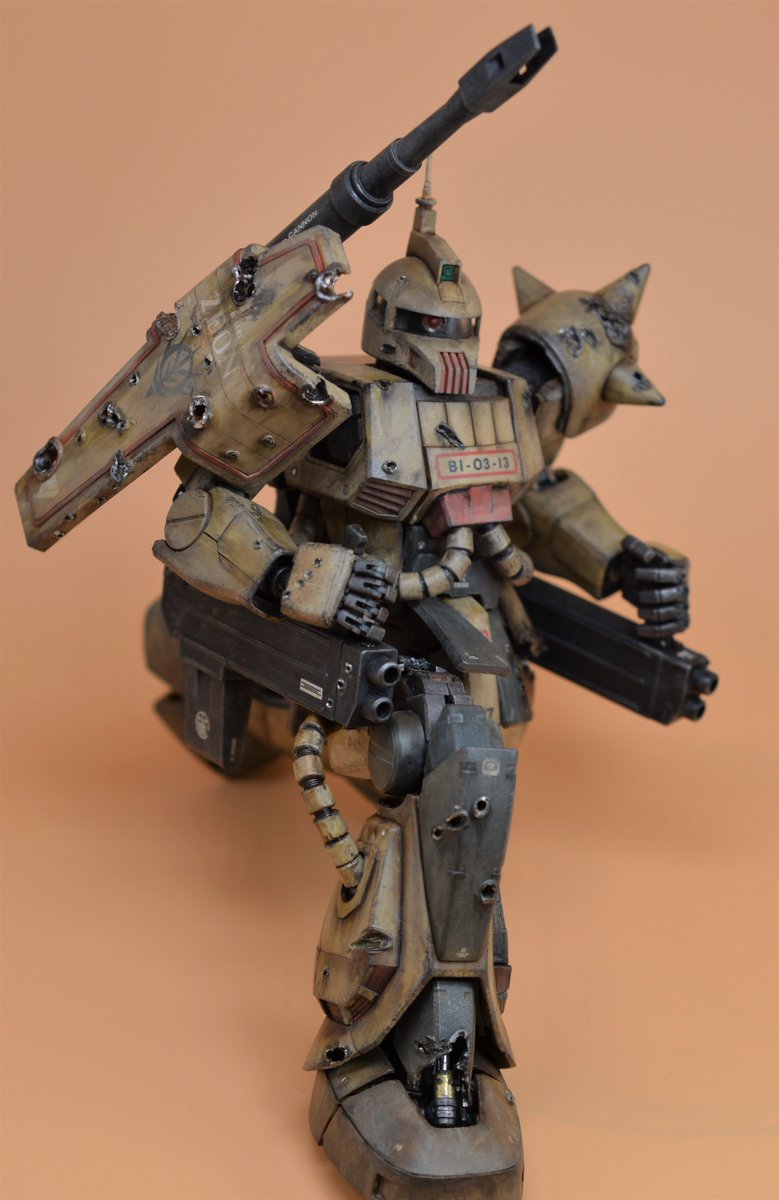 MG ザクキャノン完成しました。 外装は無塗装、成型色活かしの『砂漠ウェザリング』&『らいだ~Joe風』仕上げです。ククルス・ドアン公開に併せて…というわけではありませんが、ダメージ表現にも挑戦してみました。 続く(1/2) #ガンプラ凄技テクニック #ガンプラ好きと繋がりたい #ガンプラ
