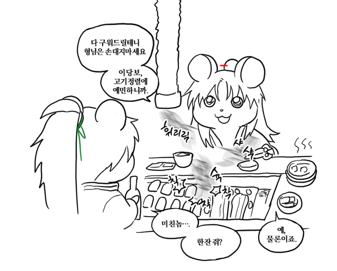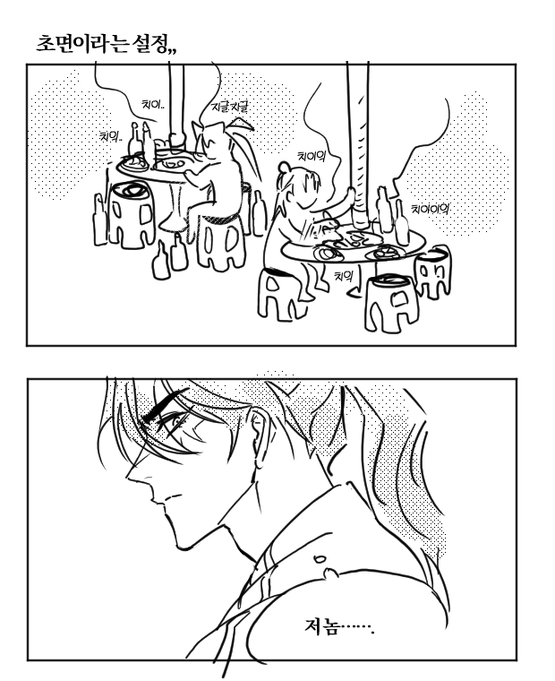 이런 첫만남 보고싶다 . .. 이러다 다른 취객들이랑 싸움 벌어지는거임 그 서슬에 테이블은 엎어지고 당보랑 청명이도 서로의 방향으로 벌렁 쓰러지는거