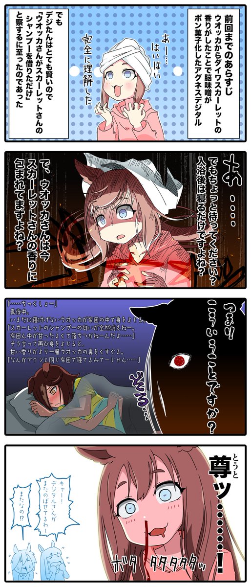 こちらは「自分如きに向けられるはずのないクソデカ感情を大量に浴びて、ただただ怯えることしかできないアグネスデジタル」でございます 遅れちゃったけどデジたん誕生日おめでとう〜🎂 #ウマ娘 #アグネスデジタル生誕祭2022