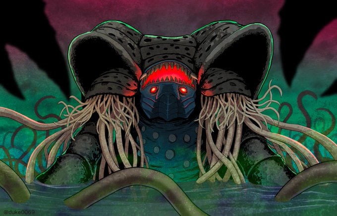 #最近フォローした人は知らない過去絵を晒す 2013年に製作したファンタジーSF怪獣漫画の表紙。 印刷した同人誌は累計100部ほど、本文データももう無いので同人誌持ってる人いたら超激レアです。