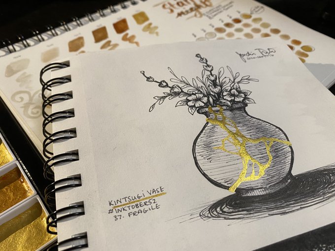 #MixedMedia #ink of a kintsugi (kintsukuroi) vase with flowers, for #inktober52 prompt 37 #fragile. #Inktober #inktober2020