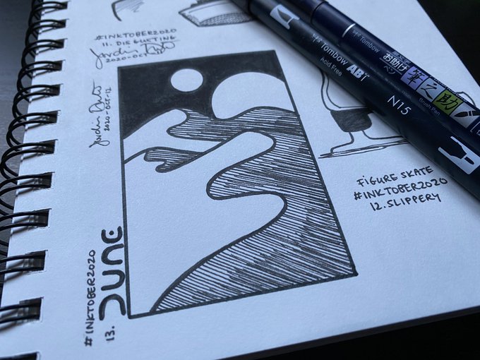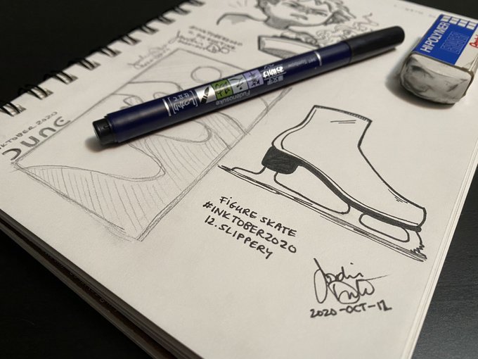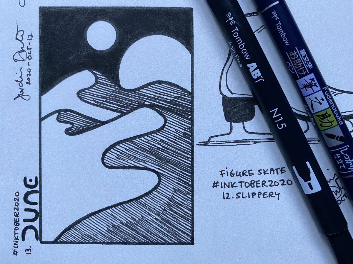 #inktober2020 Day 12! Figure skate for Prompt 12 #slippery. Sneak preview of tomorrow’s Prompt 13 Dune in the background. #Inktober #inktober2020day12 #InktoberDay12