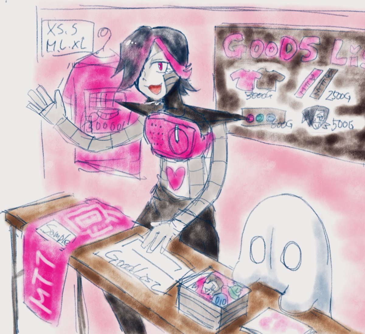 お題:「グッズ」(goods) ライブ後に物販の前を通りかかったらメタトンがグッズ手売りしてた!開演前に一通り買ってるけどまた買うしか無いよね⭐︎ #メタトン版深夜の真剣お絵描き60分一本勝負 初参加させて頂きました!