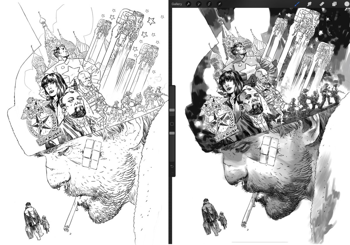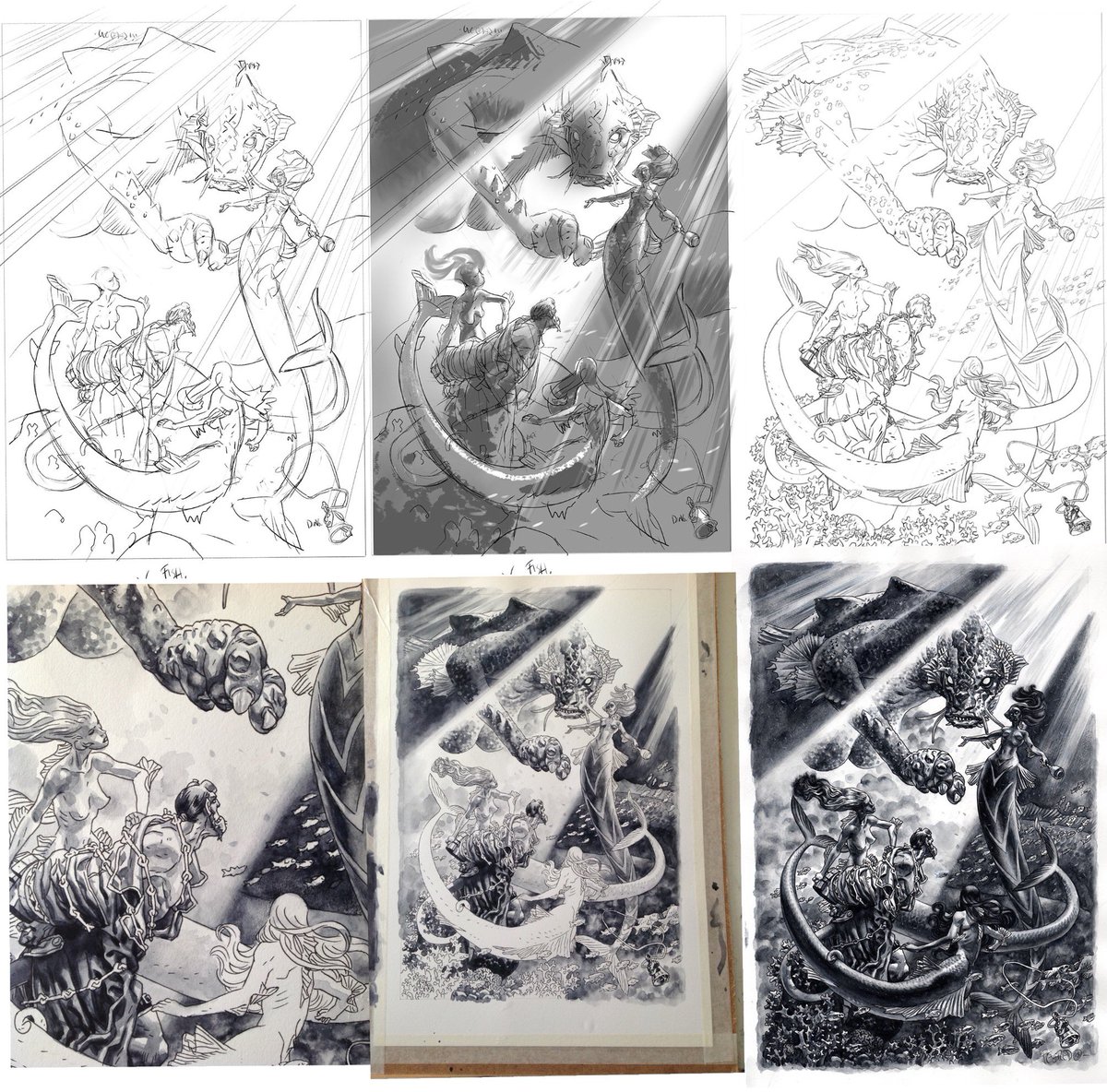 Here’s a little process for that #wintermen piece… pencils, digital value block in, the physical painting and finally a different take on the final colour.