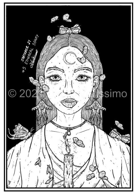 Inktober 2021 #5 - Ethereal Beauty ©2021 Diogo Veríssimo ||| #dverissimo #illustration #drawing #fantasy #digital #surreal #digitalink #inktober #inktober2021 #woman #girl #moth #dark #candles #light #darkness #transformation #magic #dream #fire #ethereal #beauty #butterfly #moon