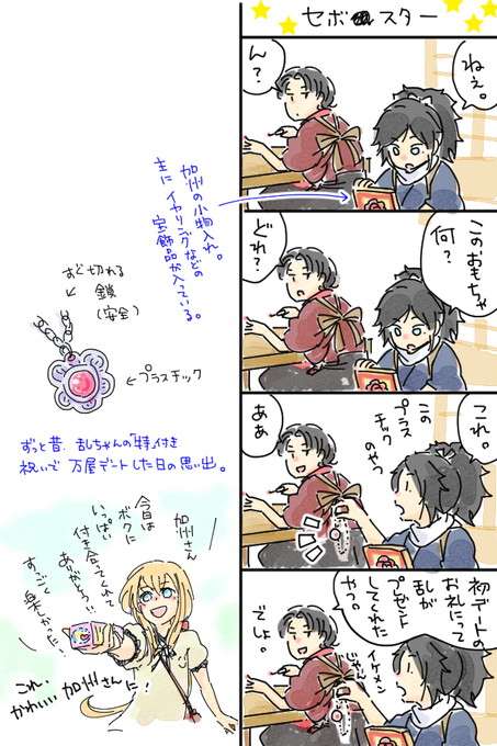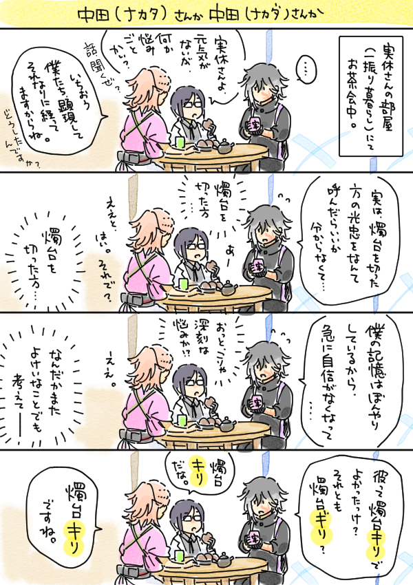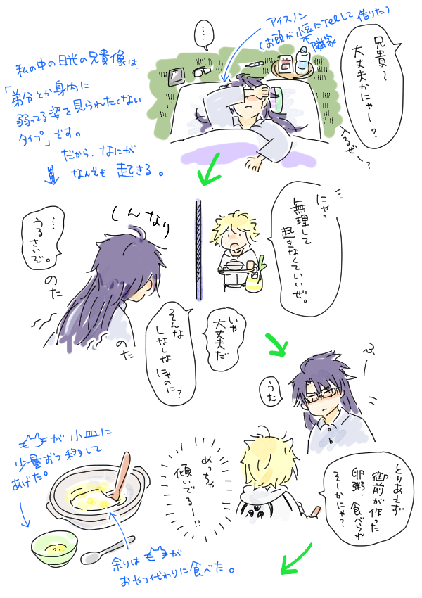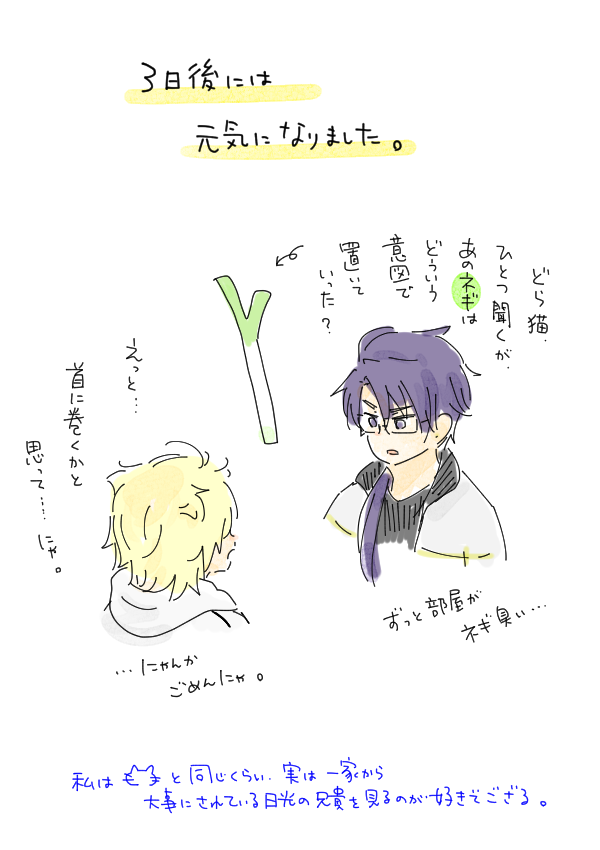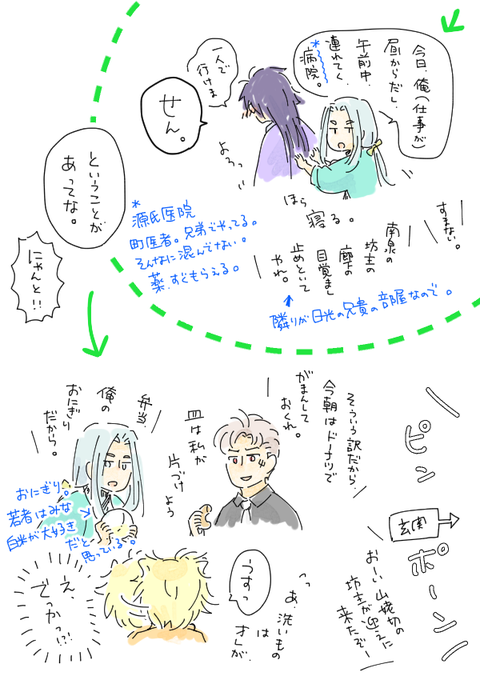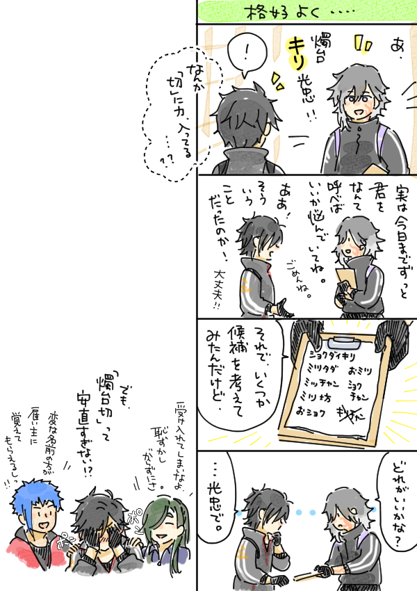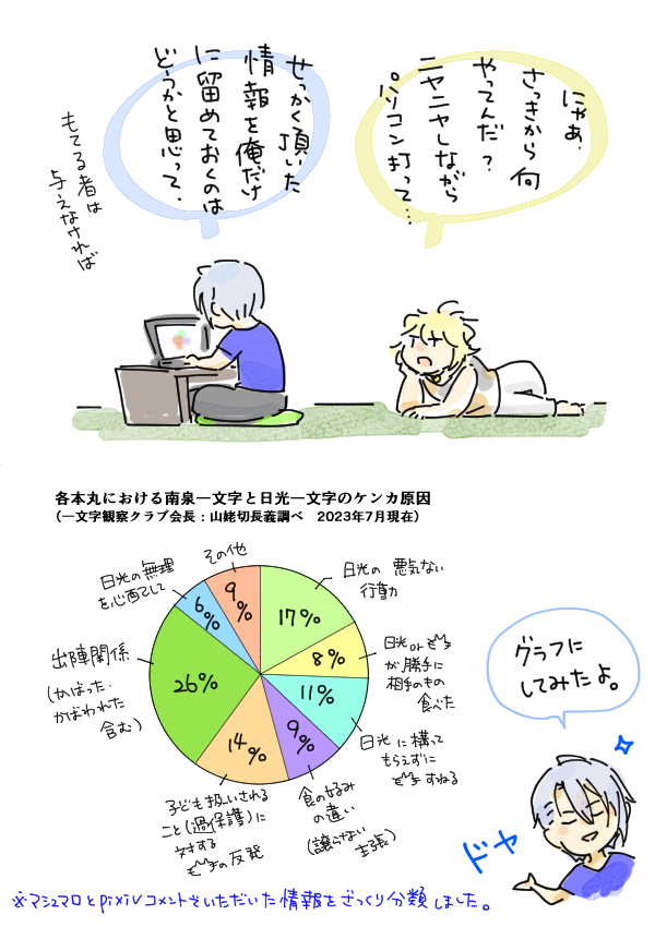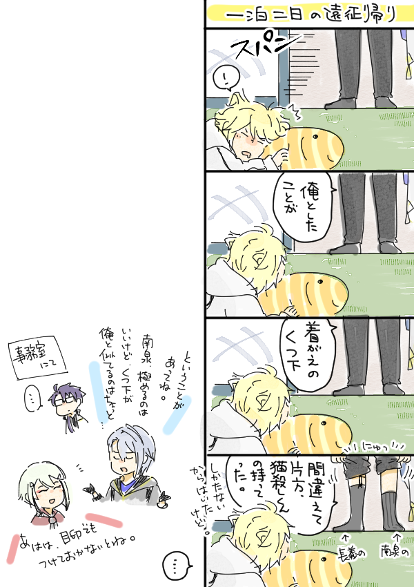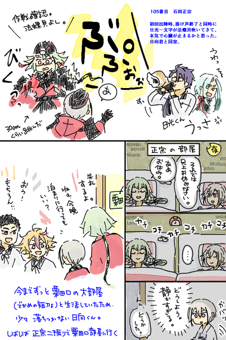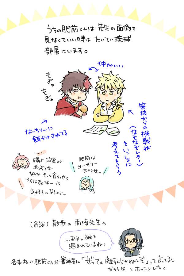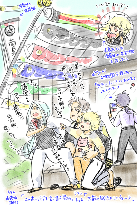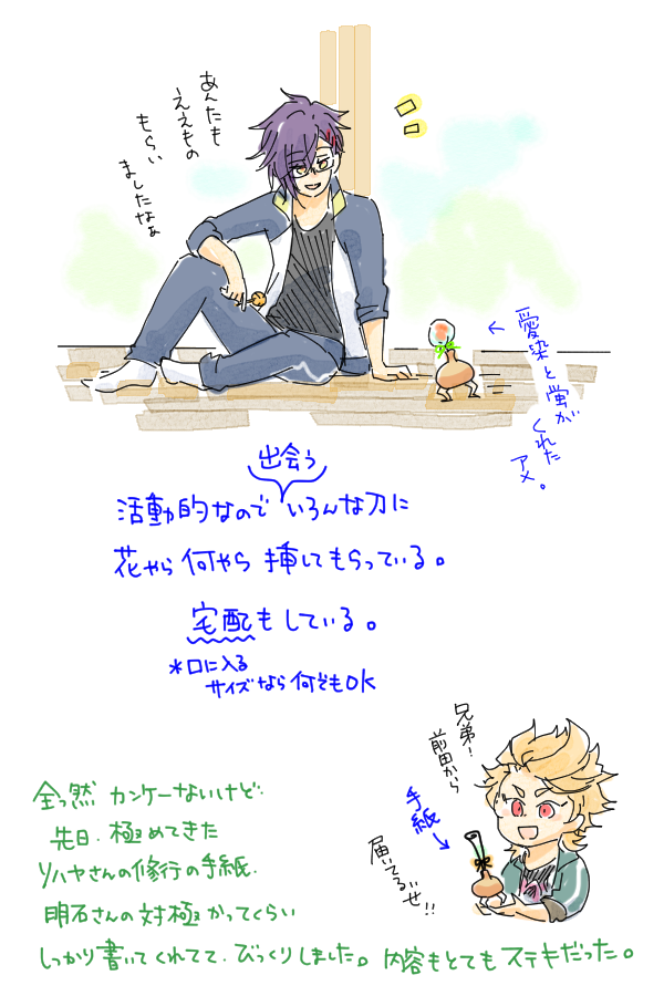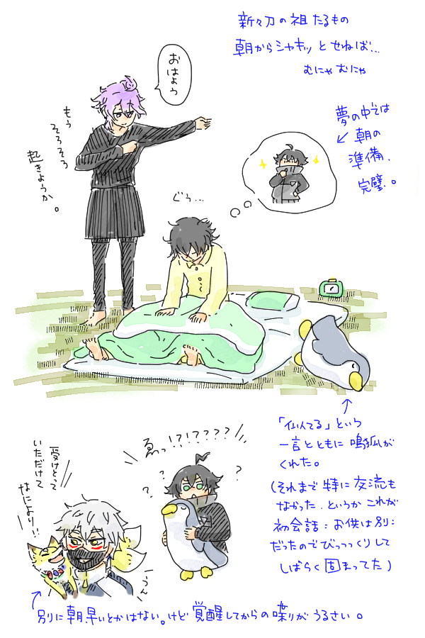 うちの長義氏 「(光景が)見える、見えるぞ・・・!!!」 うちの南泉氏 「お前、最近、疲れてんのか?」 可愛すぎて思わず落書きしてしまった。 名前幟については、もうほんと、御前そういう... 続き→marshmallow-qa.com/messages/d3ba0… #マシュマロを投げ合おう