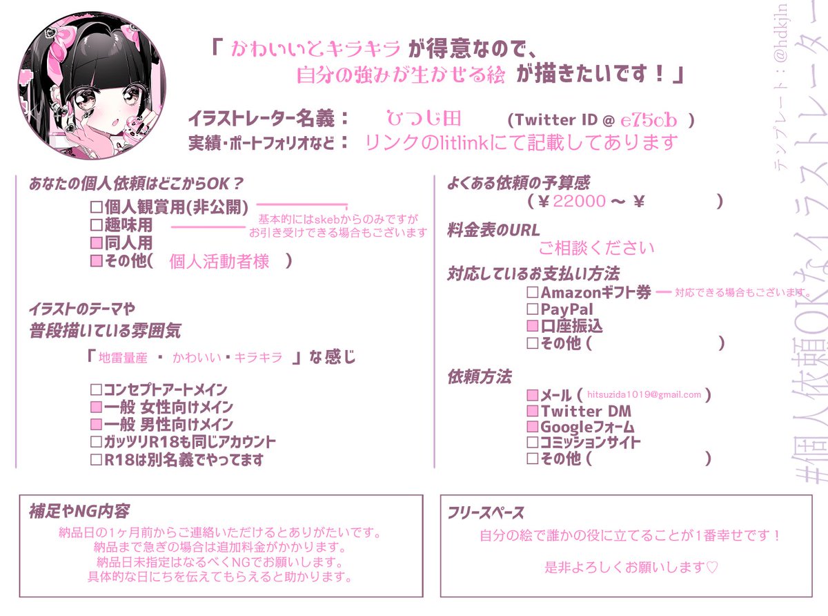 #個人依頼OKなイラストレーター かわいいとキラキラが得意です( ᐡᴗ ̫ ᴗᐡ)♡ 特に個人で活動されている方のお手伝いが出来たらと思います~!よろしくお願いします︎︎ ❤︎︎ ̖́- (現在は8月下旬納品~のみ受け付けております) 実績等▶lit.link/hitsujihitsuo