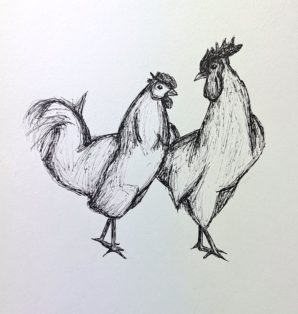 Día 16 del #inktober, para ese momento ya estaba que no podía con mi alma, aún así hice una pareja de pollos enamorados para el tema #fowl