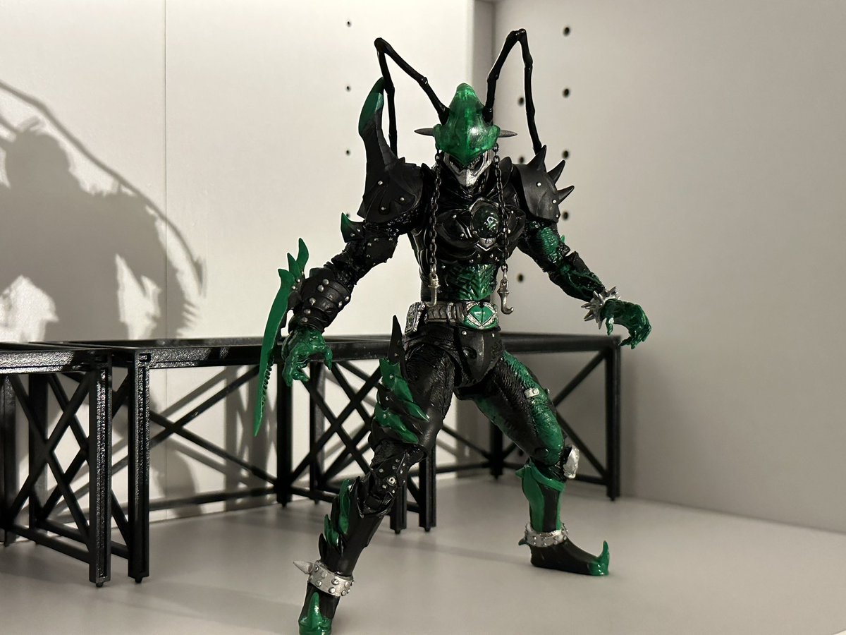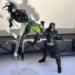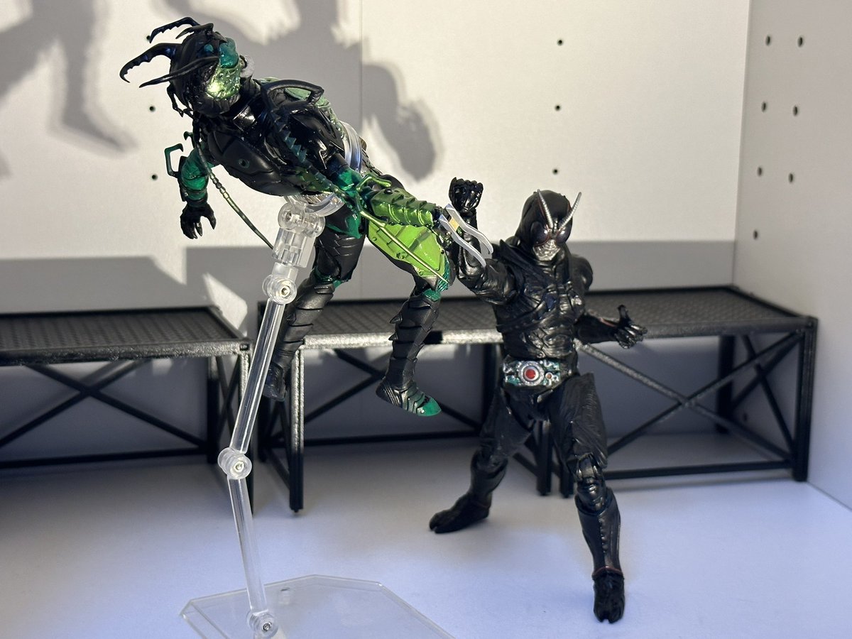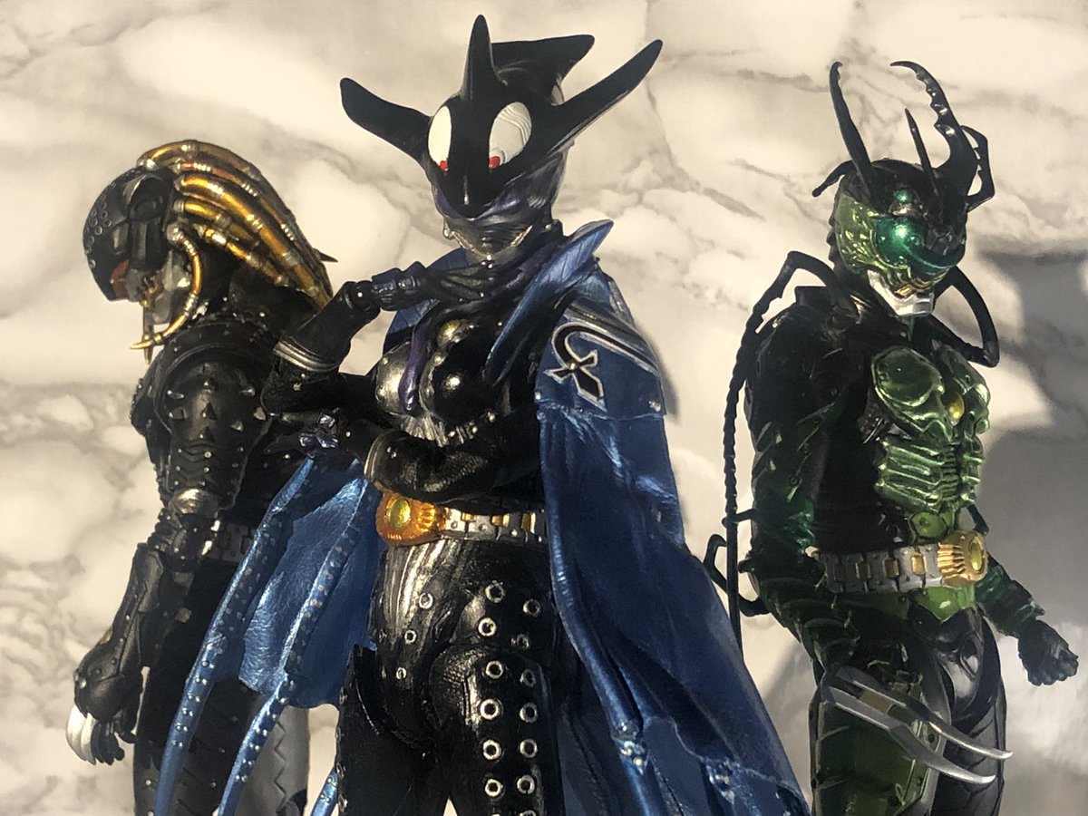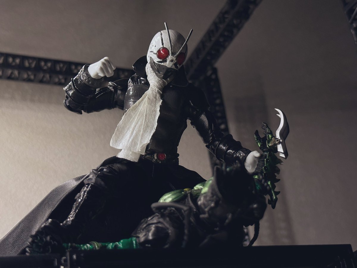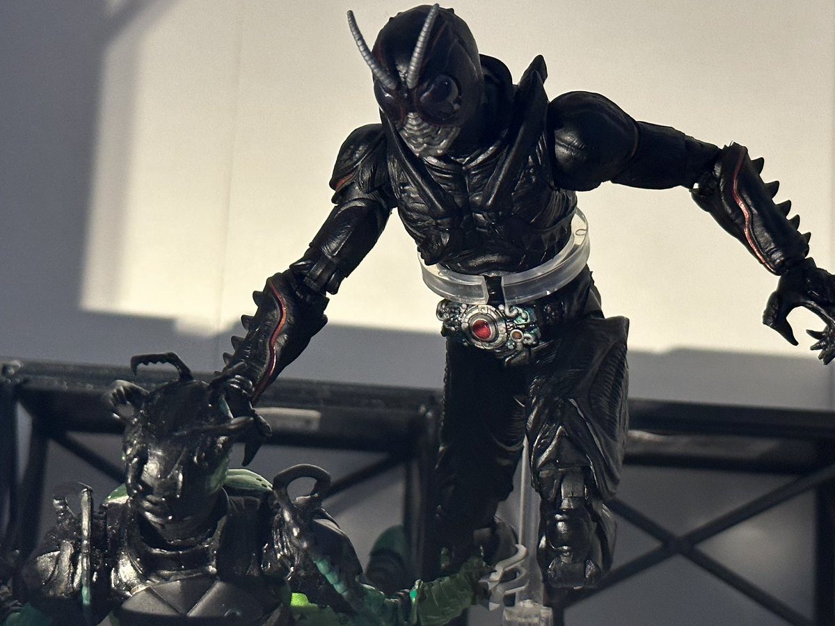 仮面ライダーBLACK SUN ソフビとマクファーレントイズのバットマンで作りました〜。いつもより少し大きめです。生々しい感じが好きですね〜。🦗 #ニチアサフィギュア改造部 #造って遊ぼ