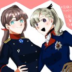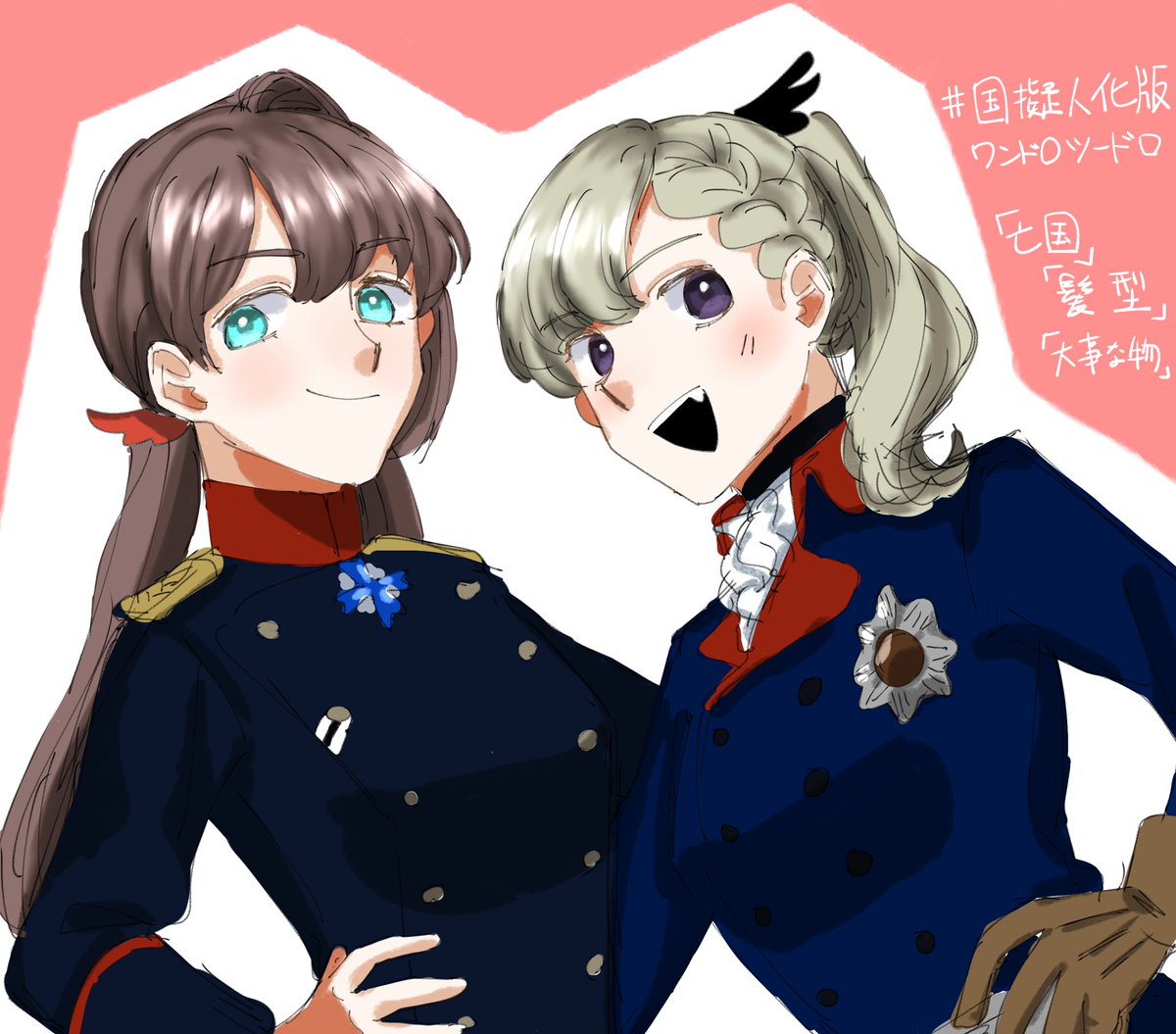 #国擬人化版ワンドロツードロ 初参加。 赤鷲黒鷲ちゃんが偉大なる王様のコスプレしながら髪型交換してみた絵です(長い)