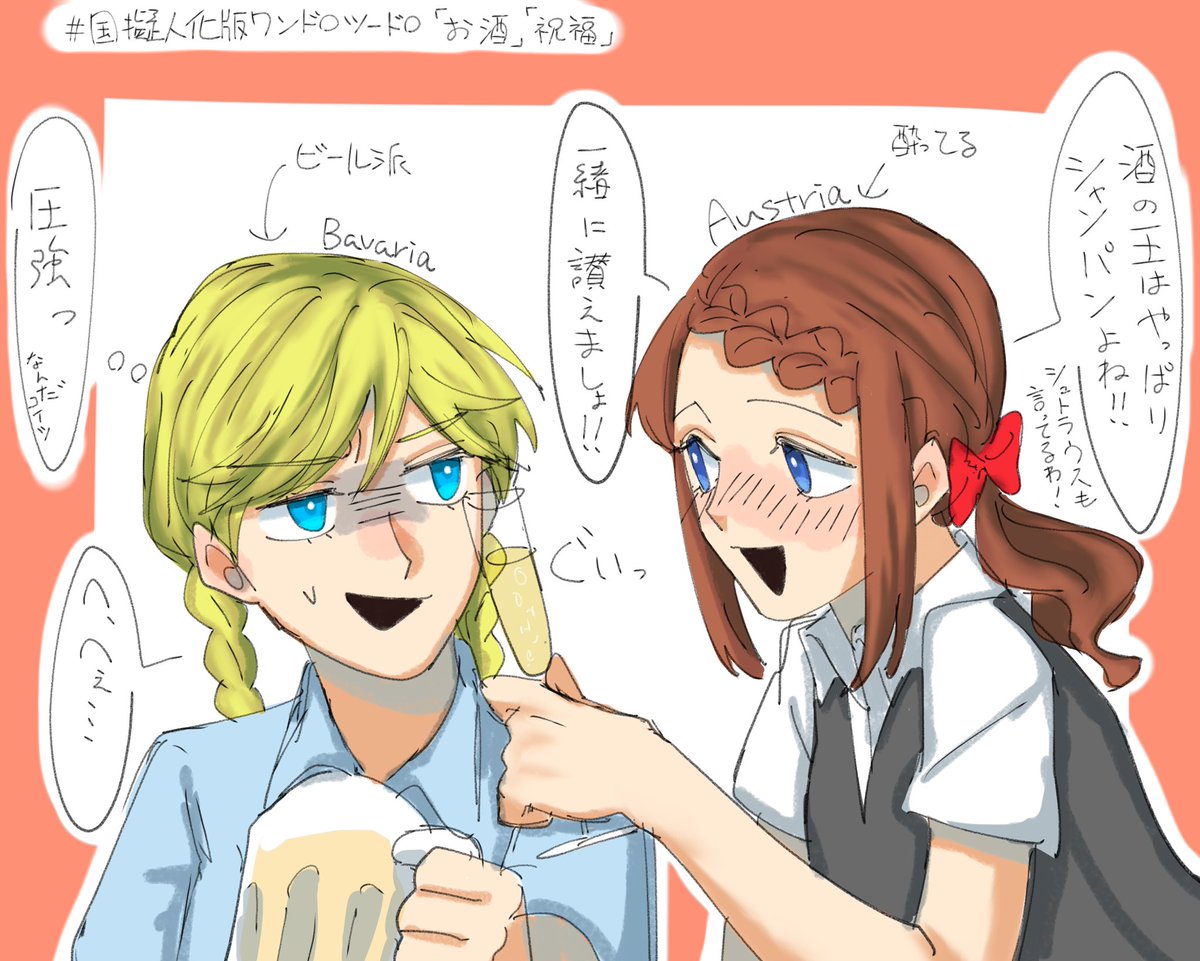 14 75 #国擬人化版ワンドロツードロ 初参加。 赤鷲黒鷲ちゃんが偉大なる王様のコスプレしながら髪型交換してみた絵です(長い) 22/05/28 23:04