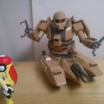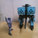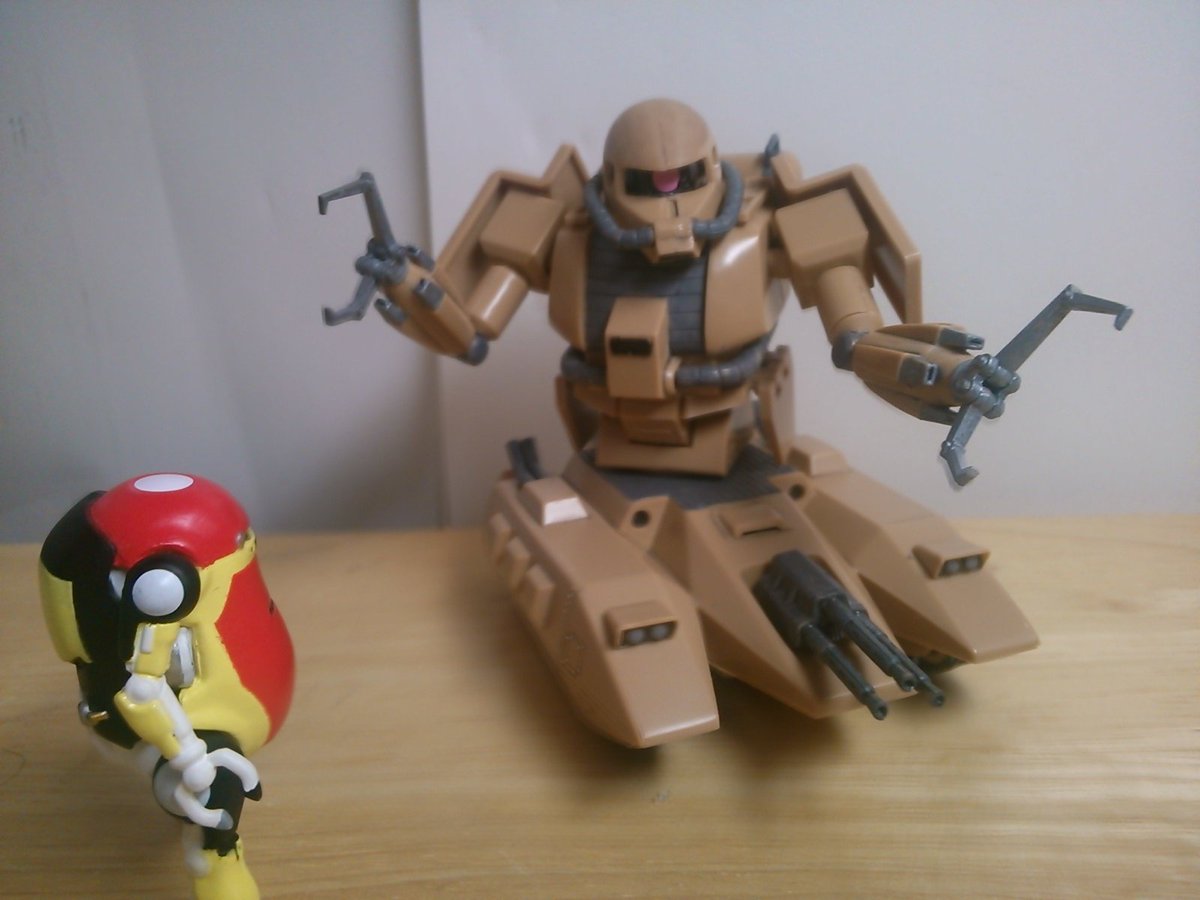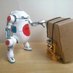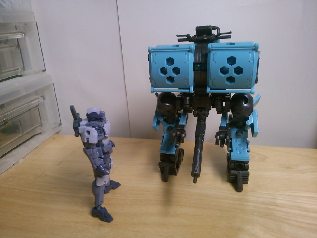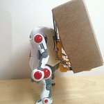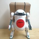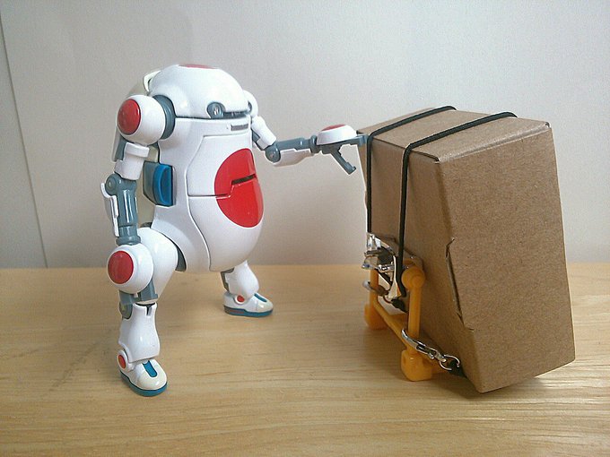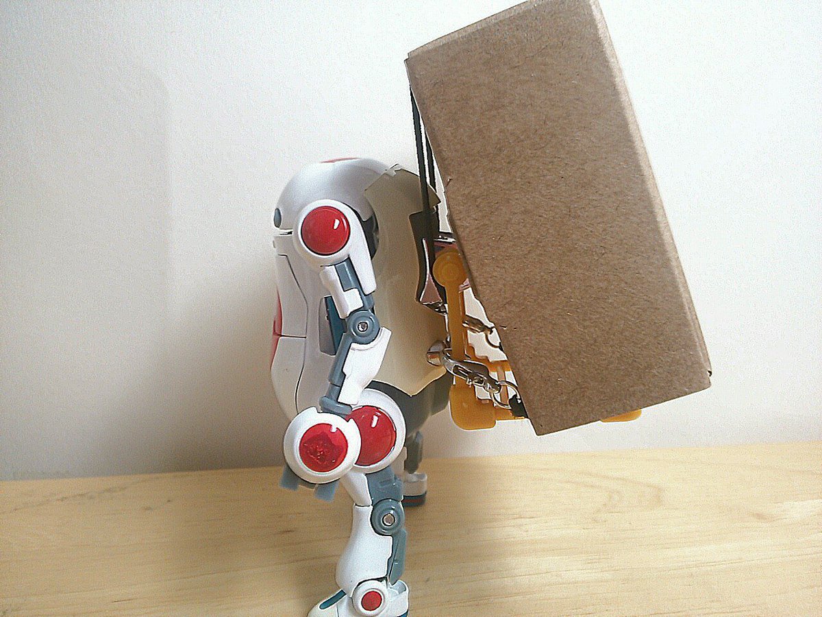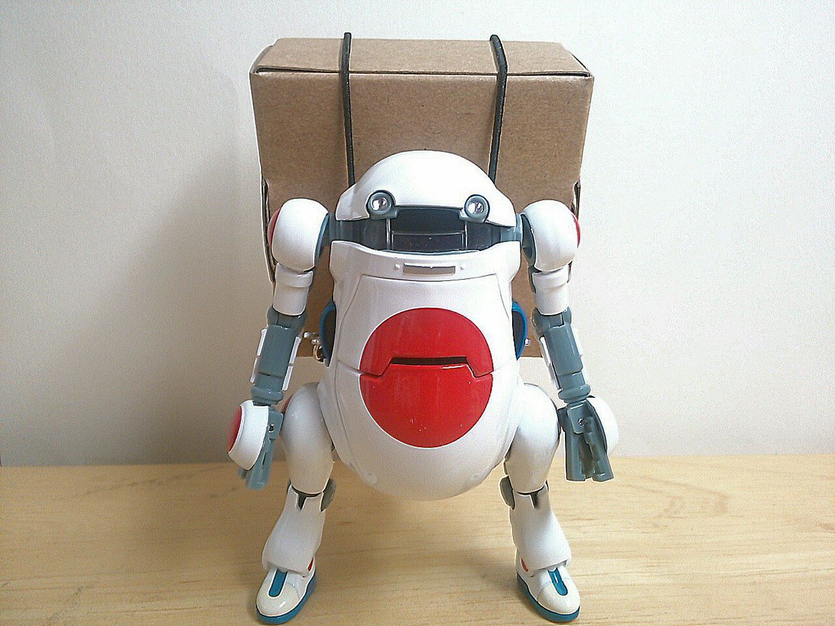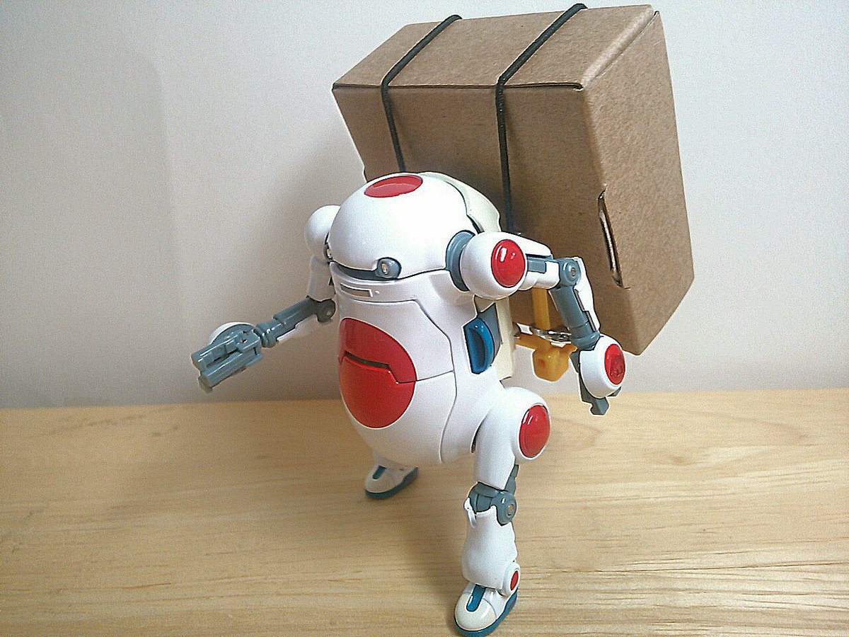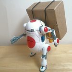 (。・ω・)ノ゙ コンチャ ①ひのまる:何だコレ? 100均で買ったミニチュアの箱を括り付けますた(笑) ②③とりあえず、ひのまるさんに背負わせてみた(笑) ④歩く姿見たら、行商のおばちゃんっぽくなった(笑) #千値練 #メカトロウィーゴ #unpan_wego