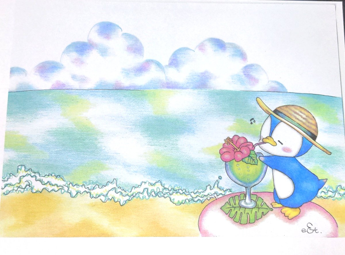 0 14 夏と海とペンギンちゃん🌺完成です♫ #イラスト #色鉛筆 #ペンギン 22/05/30 16:59