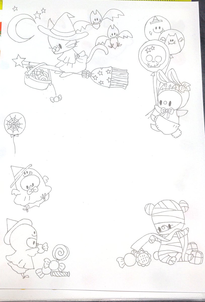 おはようございます!本日の制作過程♫これから色塗り作業です。もっと賑やかになる予定♪ #ハロウィン #イラスト #色鉛筆