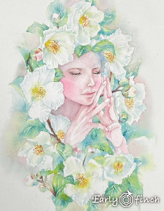 誕生花シリーズ描いてます。 7月15日ナツツバキ 花言葉『愛らしさ』 #watercolor #水彩画 #イラスト
