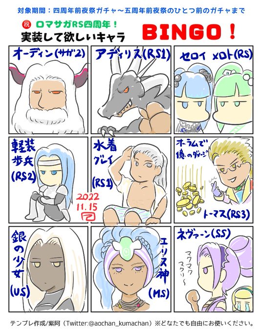 #新ロマサガRS実装して欲しいキャラビンゴ 秋の夜長にビンゴらくがき。シリーズバラけさせたつもりなのに、グレートモンド入れ忘れたぁ😗 今回も紫阿さんのテンプレお借りしました🙂 どこかビンゴしますように!!! (居残り3人はすぐ来てもいいですよ😊)