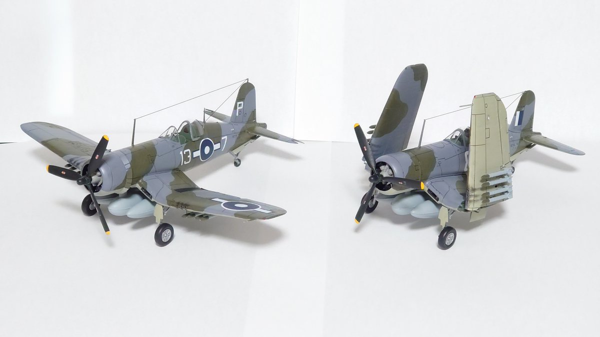 なんとか間に合いました!2月プラモはコルセアMk.II(ヴィクトリアス所属)です! 主翼展開・折りたたみ状態の両方を作ってみました!キットはタミヤ1/72、折りたたみ時の主翼断面などはハセガワのスーパーディテールから流用しています! #マンスリープラモデル #今月作ったプラモ晒そうぜ