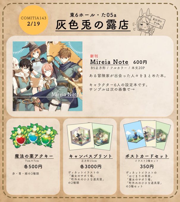 2/19開催のコミティア143のお品書きになります。 「た05a/灰色兎の露店」です。画像2枚目は新刊のサンプルになります。 久しぶりのイベント参加でとてもわくわく! ぜひ遊びに来てくださいませ〜🐰🐰🐰 #コミティア143 #COMITIA143