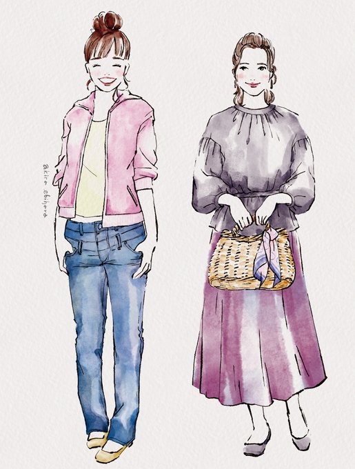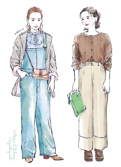 左:前にお顔だけ載せたおしゃれ子さん…の全身。 オーバーオールもグレンチェック系も大きめシルエットのジャケットも、可愛いアイテムだしこの組み合わせすごくいいと思うけど、自分ではま〜ったく似合わないので描いて眺めるのであった。 #イラスト好きさんと繋がりたい #絵描きさんと繋がりたい