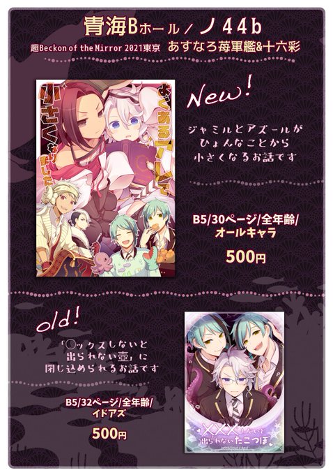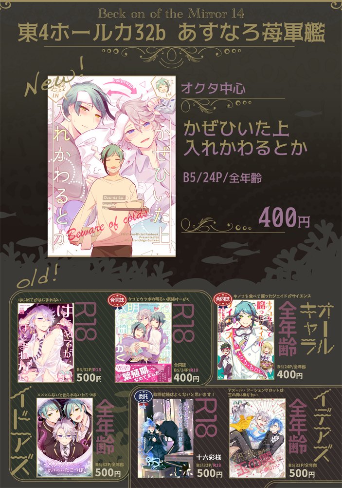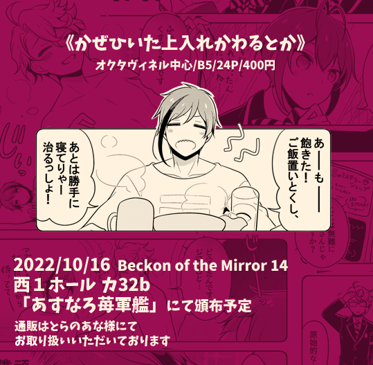 明日は Beck on of the Mirror 14 西1ホール カ32b「あすなろ苺軍艦」で参加させていただきます!よろしくお願いします☺️ 新刊サンプル→(pixiv.net/artworks/10179…) お品書き→(pixiv.net/artworks/10183…) 新刊通販→(ecs.toranoana.jp/joshi/ec/item/…)