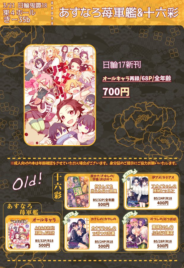 ギリギリになってしまいましたが明日、03/21 日輪鬼譚 18に東4ホール き35b 「あすなろ苺軍艦&十六彩」で参加させていただきます! 今回イベント新刊はありませんがよろしければお立ち寄りくださいませ。 【3/21日輪18】おしながき | ゑびちん #pixiv pixiv.net/member_illust.…