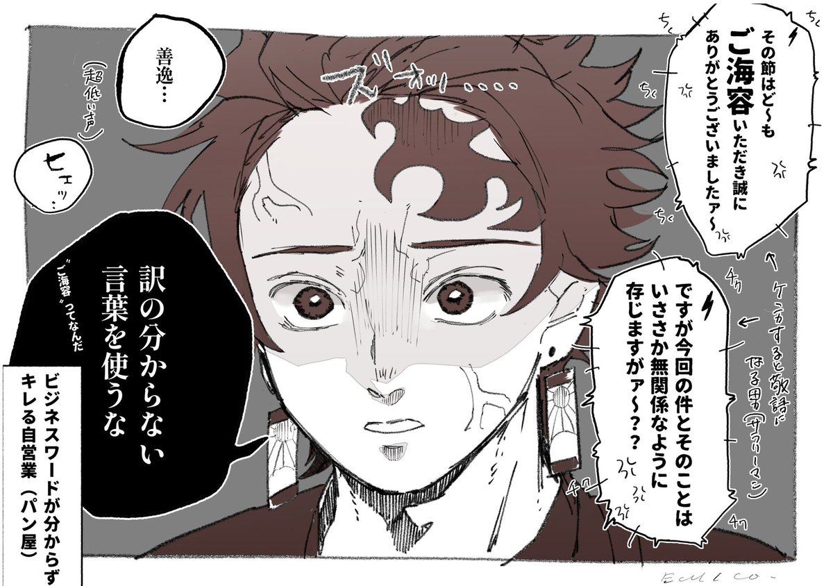 22 165 # もらったセリフで一コマ 「ご海容」 ⚠︎現パロ炭善 (ご海容、使い方あってるかな…!?) 23/07/12 21:15