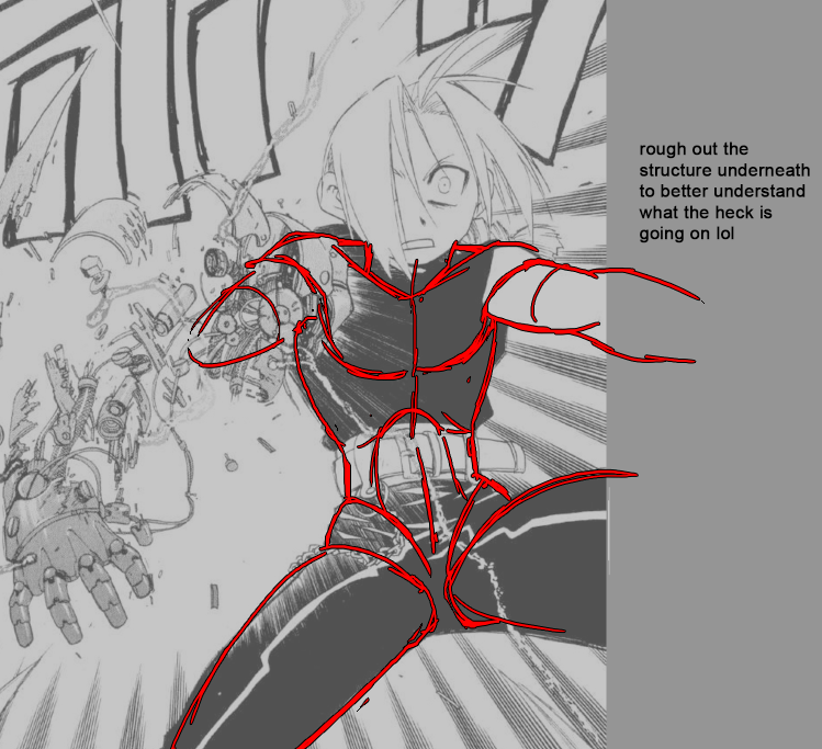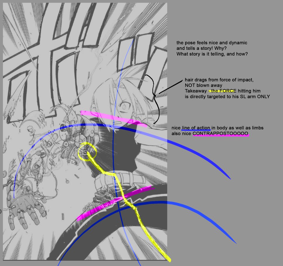 Retweeted a post earlier about breaking down images you like with your own notes to better understand the answers to your questions about WHY you like it. A friend asked for advice on how to start, so here's an example! Using a panel from FMA, by Hiromu Arakawa
