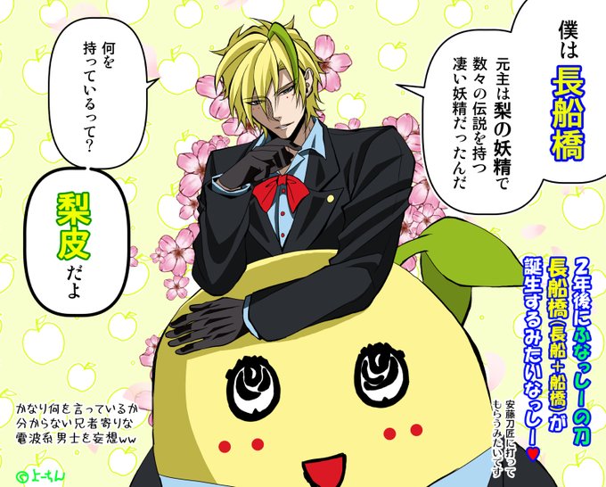 【刀剣乱舞×ふなっしー】 ふなっしー1885歳のお誕生日おめでとうございます🎊 原稿中につき新規絵が描けず去年のを再掲でごめんなっし!!ホントふなっしーが刀剣にハマってくれたお陰でこちらもふなっしーにハマれ、創作活動がより一層楽しくなり感謝感激梨汁ブシャー😘💕 #ふなっしーBD2023 #梨の日