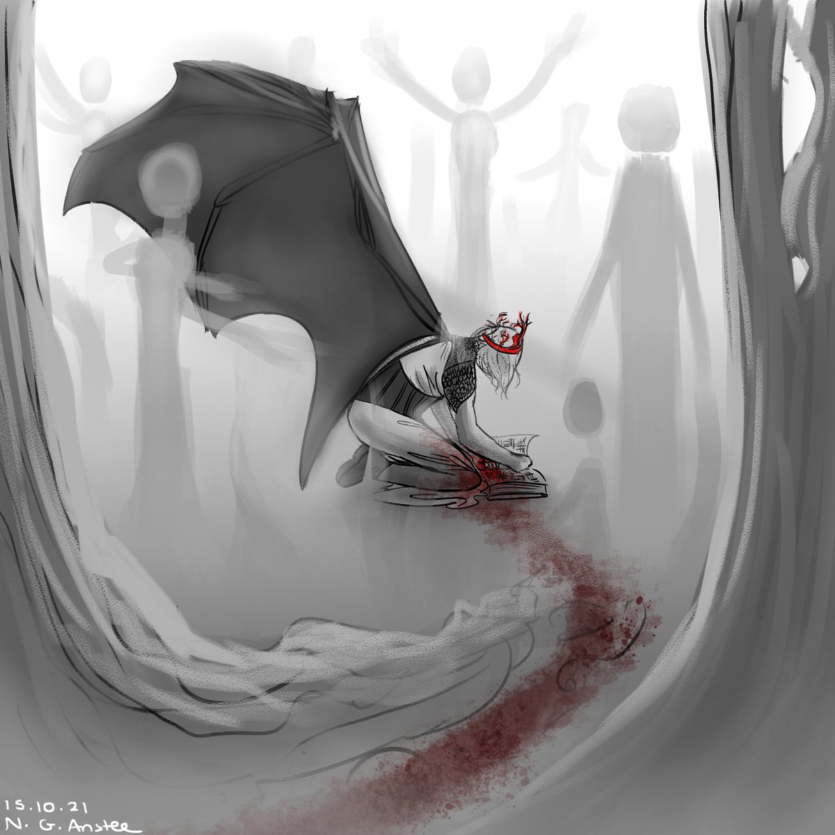 Inktober 52 weeks 37-39 - spooky, statue, monarch; Shriektober - spellbook #shriektober #inktober #inktober52
