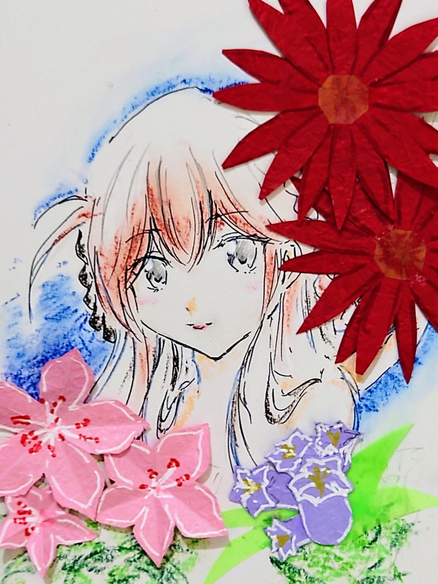 花言葉:感謝(赤いカーベラ)x笑顔(カルミア)x挑戦(紫の風鈴草) デジタル(水彩風)← アナログ→ 素材 人物:筆ペン+パステル+白インク 花 :切り紙+白インク #計算中イラスト募集 #ナナニジ #立川絢香