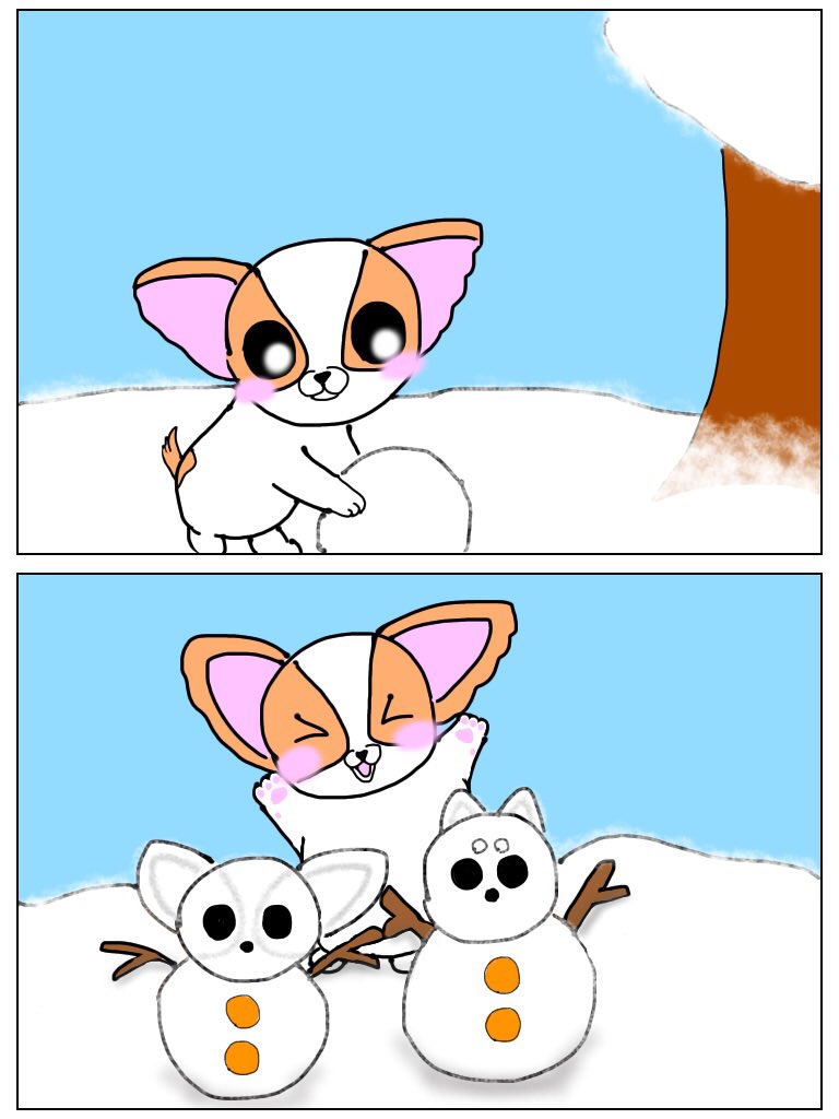 今日の動物達の日常は…? メープルくんのお話。 メープルくんは雪を転がしているみたいだね❄️ 何をしているのかな? あれ? もしかしてメープルくんと豆太くんの雪だるまかな?⛄️⛄️ 上手に出来たね! #2コマ漫画 #イラスト好きさんと繋がりたい #絵描きさんと繫がりたい