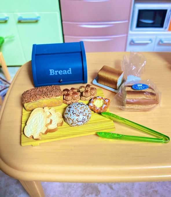 カリタのブレッドケース可愛い(о´∀`о) メガハウスのパンと一緒に撮影✨ メガハウスのミニチュアパンはめっちゃ出来が良くて、見てるだけで🍞食べたくなるw #ミニチュア #オモ写