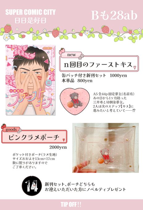 8/20 SUPERCOMICCITY TIPOFF!! 【合同サークル 日日是好日】 mti×固定夢主 夢漫画 及び グッズのお品書きです ⚠︎新刊セット、ポーチには数に限りがあります ⚠︎開始時の高額紙幣でのお取引はお断りしております サンプルはリプ欄に繋げます🙇♀️