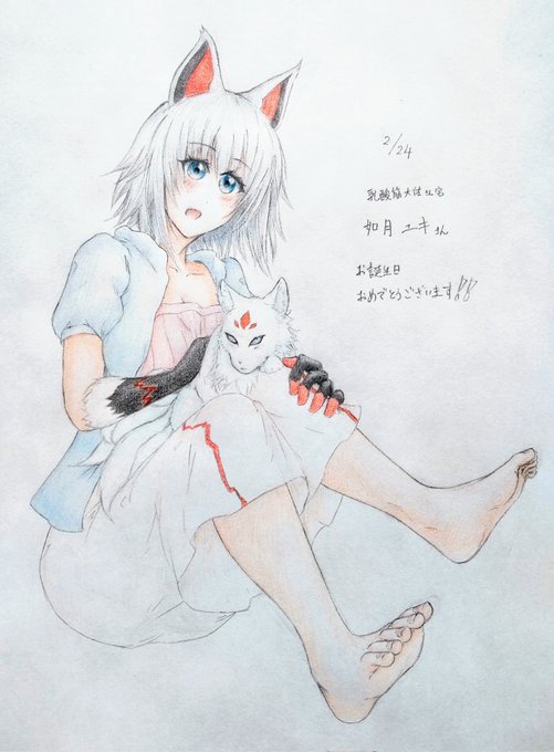 2/24 如月ユキさん お誕生日 おめでとうございます‼️🎉🎉 小さなお狐さんの キュロさんも描いてみました~ 多分ズボンだったのかしら…💧 スカートver.ということで😅
