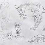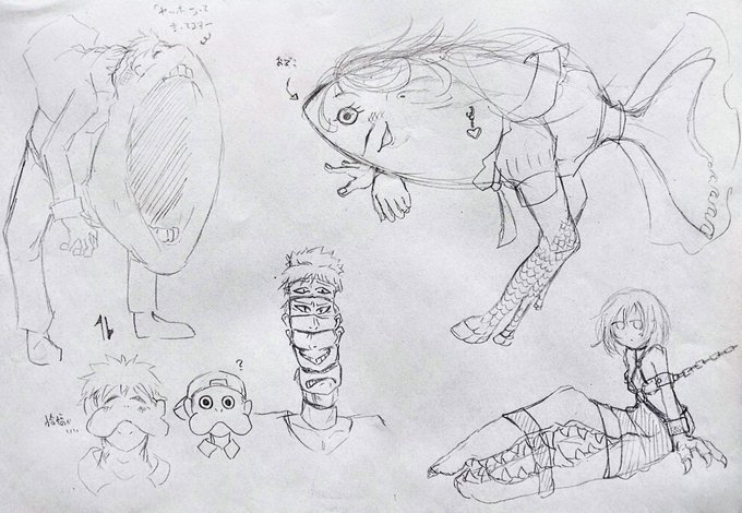 3 23 前描いた落書き~ 左上から 大口さん お腹辺りまで開く 魚人間さん 2つ目のエラは口で 反対側にもあります だるま落とし兄弟 足の先まで 兄と弟が交互になっている ワニ脚さん 手も爬虫類っぽい 足で這うようにして進める なかなか面白い形ができた(*^^*) 22/10/27 12:00