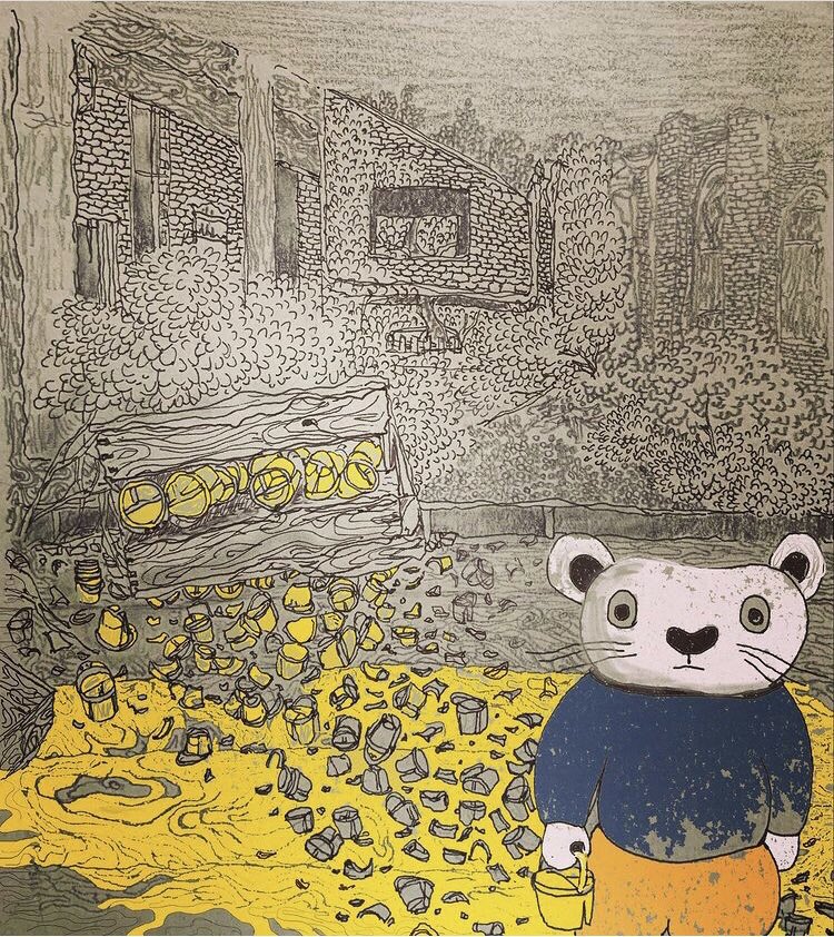 #秋なので黄色の作品をのせる 筆洗バケツの墓場