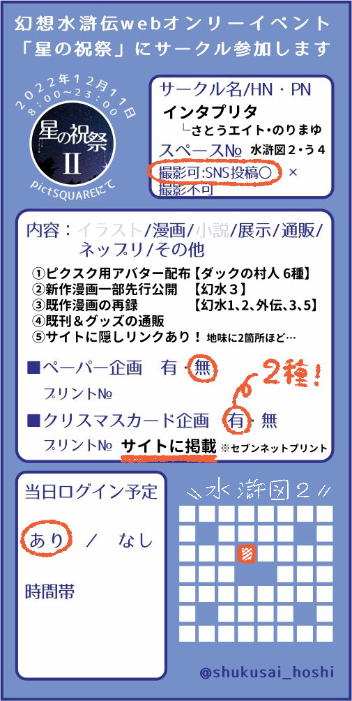 最終版のお品書きです!色々盛りだくさんとなっておりますので、どうぞごゆるりとお過ごしくださいませ! 加えて、ダックたちのアバターを使ったクリスマスカードもご用意いたしました! ネットプリントの予約番号はイベント会場にて! #星祝祭2 #星祝祭2_参加 #星祝祭2_お品書き #星祝祭2_クリスマス