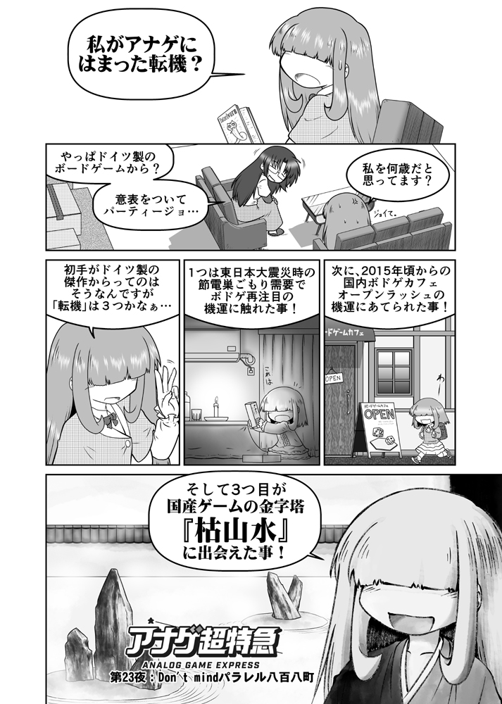 147 238 そろそろGMウォーロック最新号出るヨ! アナゲ紹介連載まんが『アナゲ超特急』最新話は2つの日本題材ゲームをご紹介。 1つは国産ボドゲの金字塔『枯山水』!! 座禅を組んで「徳」を高めて他の僧侶から苔を強奪したりもする徳の高い作庭ゲームとして有名ですね。 23/07/20 12:25