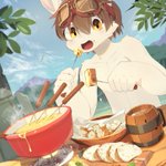 えいぽんたろをさんのコミッション「晴れた空の下で、色々な具材が刺さったチーズフォンデュを美味しそうに食べるアルナくんをお願いします!」 skeb.jp/@eipontarowo/w… #Skeb #Commission @skeb_jp skeb納品しました!